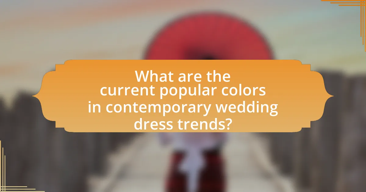The current popular colors in contemporary wedding dress trends include shades like ivory, blush, and champagne. These colors have gained traction due to their versatility and ability to complement various skin tones. Additionally, deeper hues such as navy, emerald green, and burgundy are increasingly favored for their elegance and sophistication, reflecting a shift towards personalized and unique wedding aesthetics. According to a survey by The Knot, over 30% of brides in recent years have opted for non-traditional colors, indicating a growing trend towards individuality in wedding attire.
